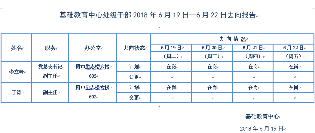 基础教育中心处级干部2018年6月19日—6月22日去向报告