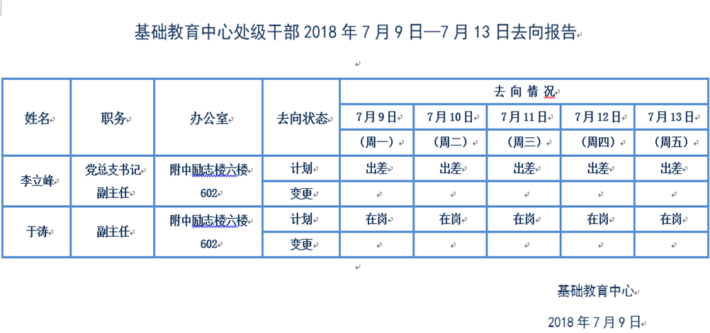 基础教育中心处级干部2018年7月9日—7月13日去向报告