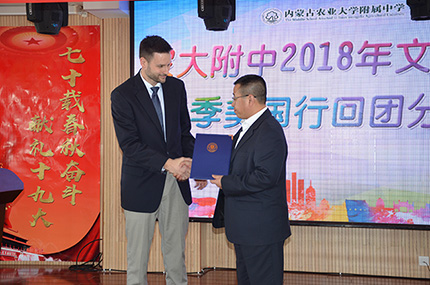 Mark先生向我校颁发《国际人才培养基地学校联合声明》双方互为海外分校 |